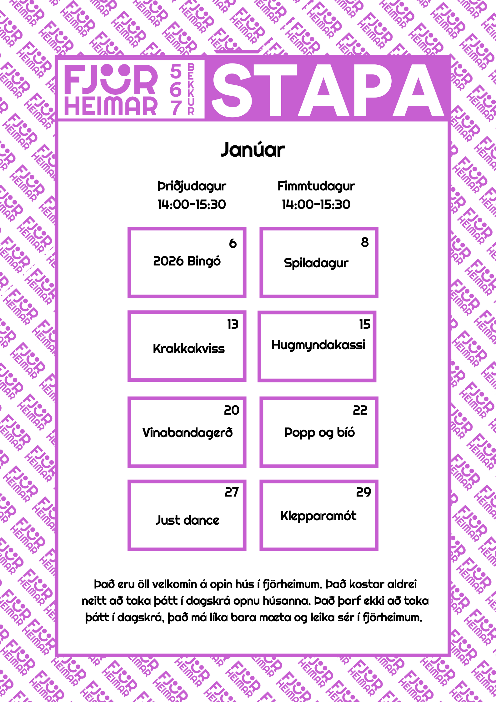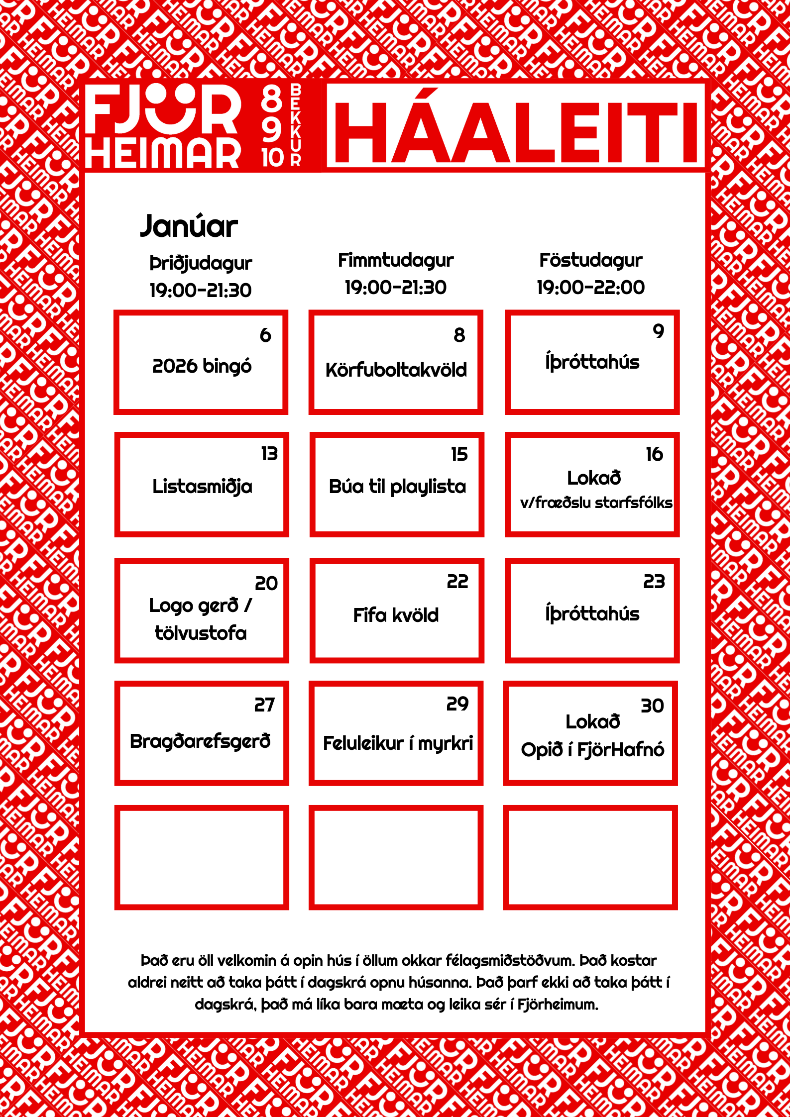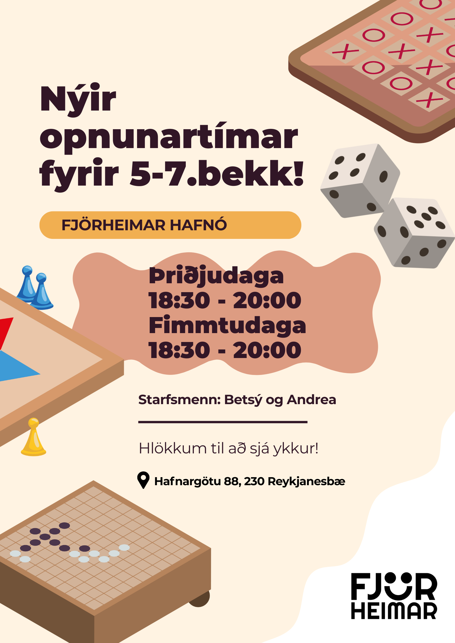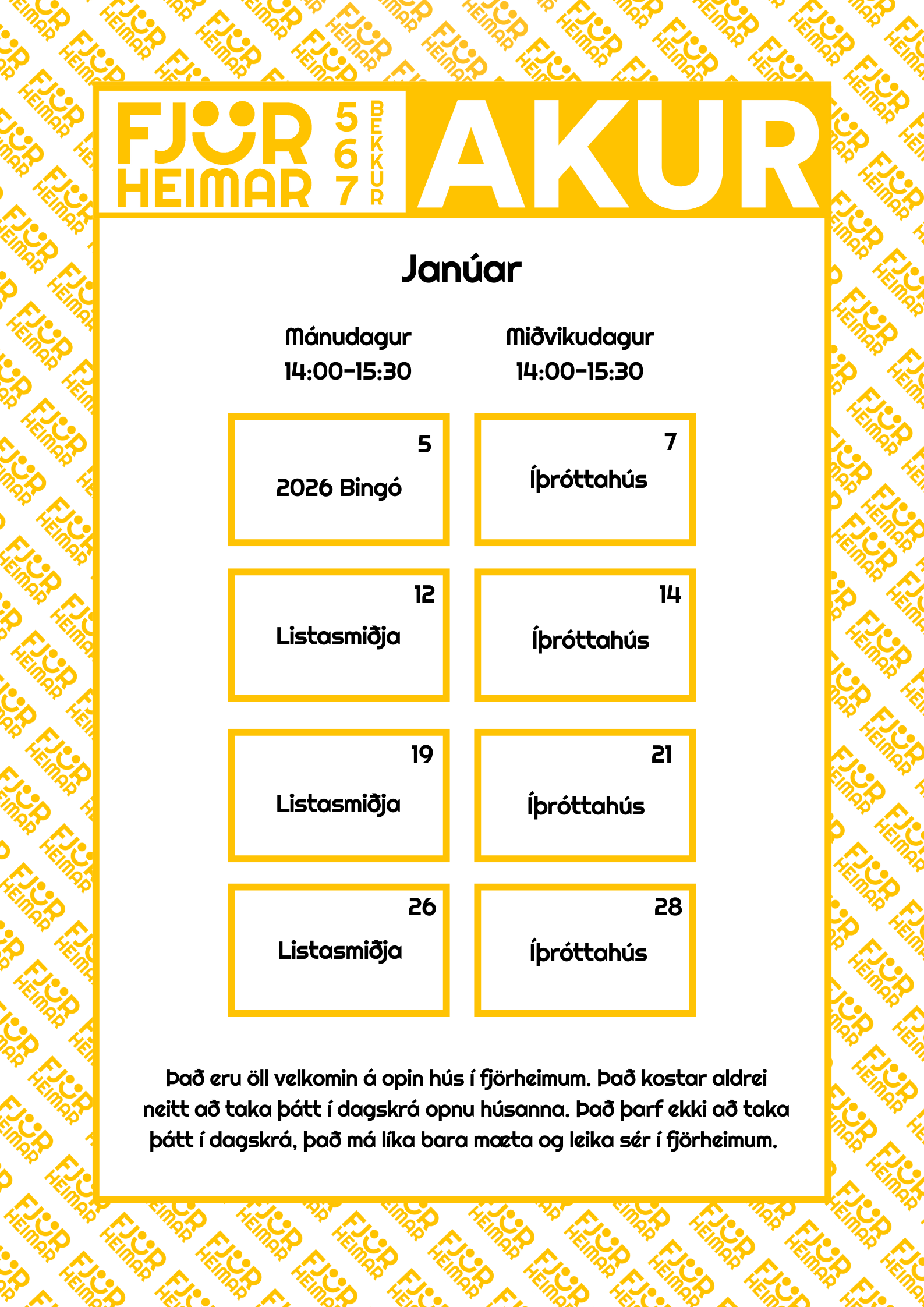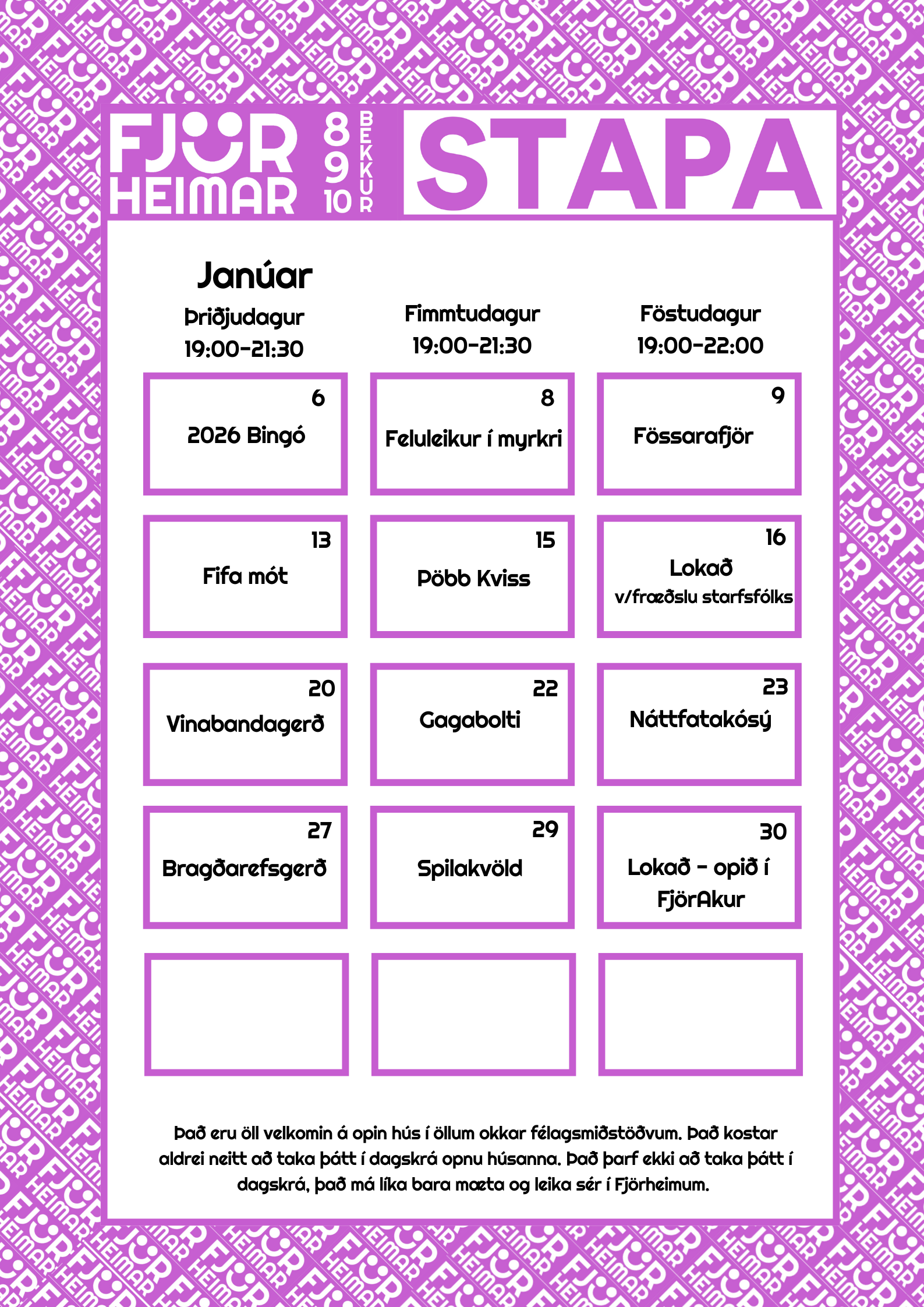 Með þessu fyrirkomulagi geta unglingar tekið þátt í starfi í sinni hverfisfélagsmiðstöð, en jafnframt eru allar félagsmiðstöðvar Fjörheima opnar öllum. Hver félagsmiðstöð er með tvær opnanir í viku fyrir 8.-10.bekk ásamt öðrum hverjum föstudegi, einnig er opið fyrir 5.-7.bekk tvo daga í viku ásamt séropnun fyrir 7.bekk einu sinni í viku. Nánari upplýsingar um hverja félagsmiðstöð fyrir sig má finna hér fyir neðan. Markmiðið er að félagsmiðstöðin sé áfram öruggur og jákvæður vettvangur þar sem börn og ungmenni geta hist, tekið þátt í skapandi og fjölbreyttu starfi og byggt upp vináttu og tengsl. Við hvetjum öll til að taka þátt í starfinu okkar, hvort sem það er í sinni hverfisfélagsmiðstöð eða annars staðar og við hlökkum til að taka á móti ykkur 💛