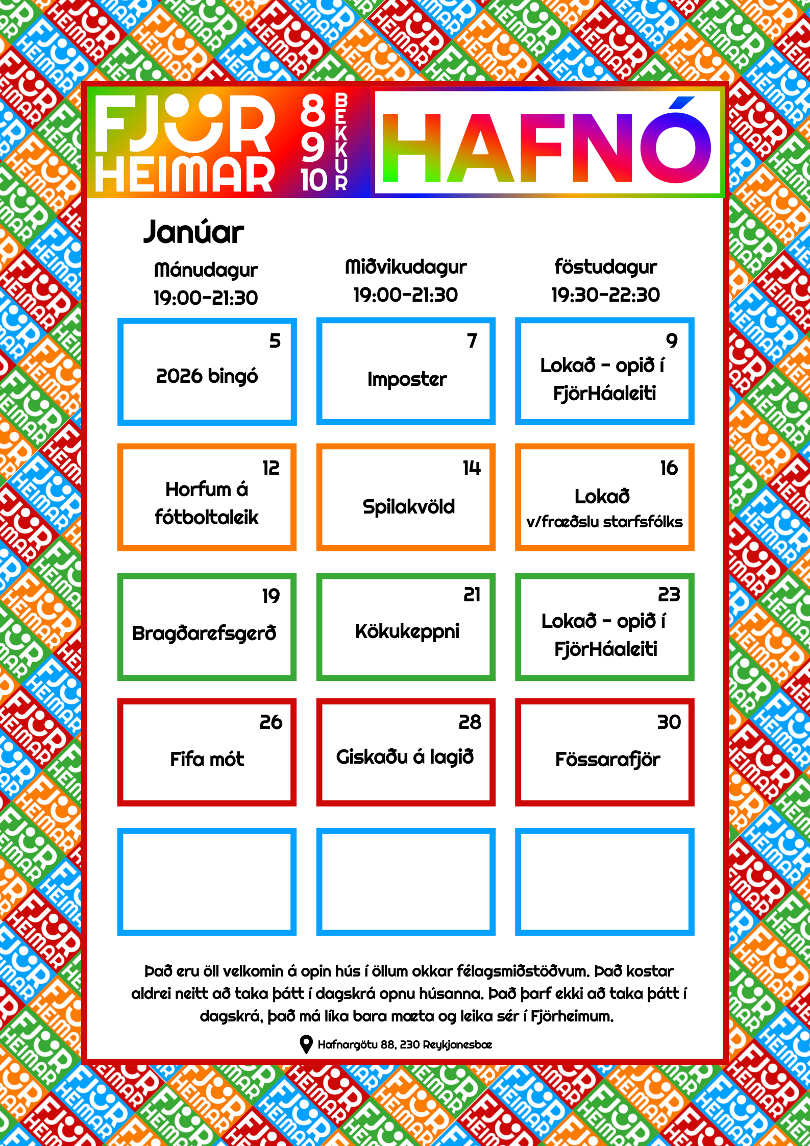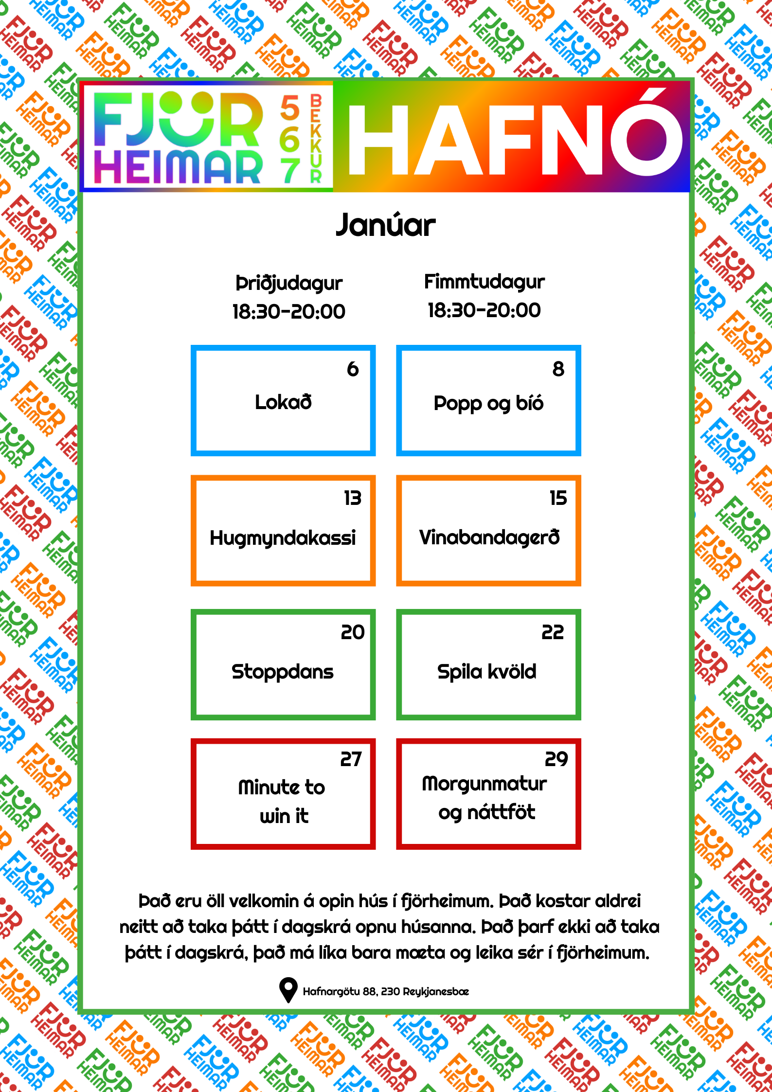Félagsmiðstöðin Fjörheimar kynnir nýjung í starfi sínu: hinsegin opnanir alla fimmtudaga kl. 20:00–22:00 í húsnæði okkar að Hafnargötu 88. Hinsegin opnanir eru ætlaðar ungmennum á aldrinum 13–17 ára og er markmið þeirra að skapa öruggt, hlýtt og opið rými þar sem hinsegin ungmenni geta verið þau sjálf og kynnst öðrum hinsegin ungmennum. Markmið félagsmiðstöðvarinnar er að veita hinsegin ungmennum stuðning, styrkja eigin sjálfsmynd og gefa þeim kost á að tilheyra hinsegin samfélagi. Á opnununum verður lögð áhersla á notalegt andrúmsloft, samveru og starfsemi sem mótast af þörfum og áhuga þátttakenda. Starfsfólk á opnununum eru Sonja og Andrea. Öll sem skilgreina sig sem hinsegin eða eru í hinsegin pælingum, eru hjartanlega velkomin. 🌈Sjáumst í Fjörheimum á fimmtudögum!