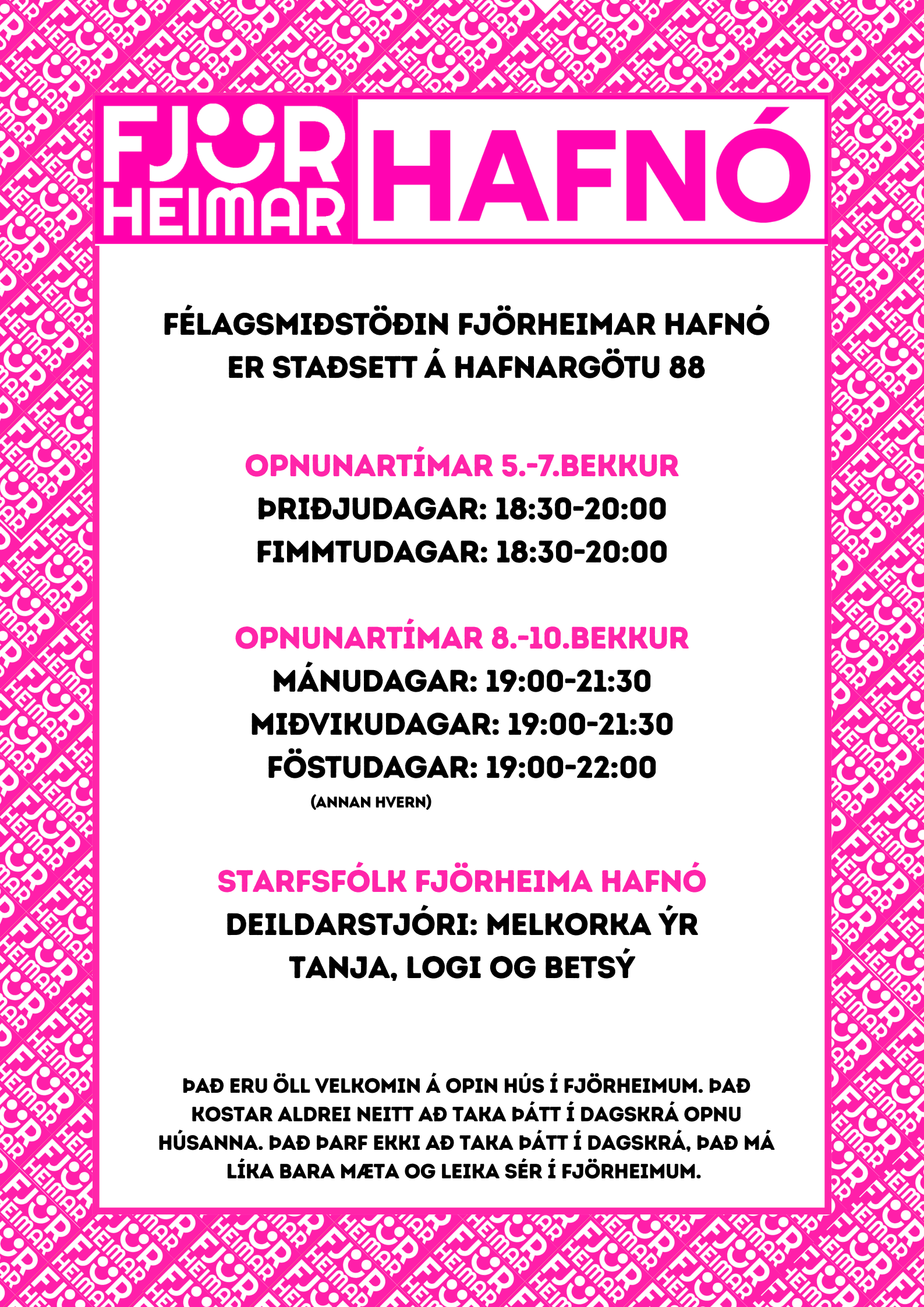 Félagsmiðstöðin Fjörheimar kynnir nýjung í starfi sínu: hinsegin opnanir alla fimmtudaga kl. 20:00–22:00 í húsnæði okkar að Hafnargötu 88. Hinsegin opnanir eru ætlaðar ungmennum á aldrinum 13–17 ára og er markmið þeirra að skapa öruggt, hlýtt og opið rými þar sem hinsegin ungmenni geta verið þau sjálf og kynnst öðrum hinsegin ungmennum. Markmið félagsmiðstöðvarinnar er að veita hinsegin ungmennum stuðning, styrkja eigin sjálfsmynd og gefa þeim kost á að tilheyra hinsegin samfélagi. Á opnununum verður lögð áhersla á notalegt andrúmsloft, samveru og starfsemi sem mótast af þörfum og áhuga þátttakenda. Starfsfólk á opnununum eru Sonja og Andrea. Öll sem skilgreina sig sem hinsegin eða eru í hinsegin pælingum, eru hjartanlega velkomin. 🌈Sjáumst í Fjörheimum á fimmtudögum!