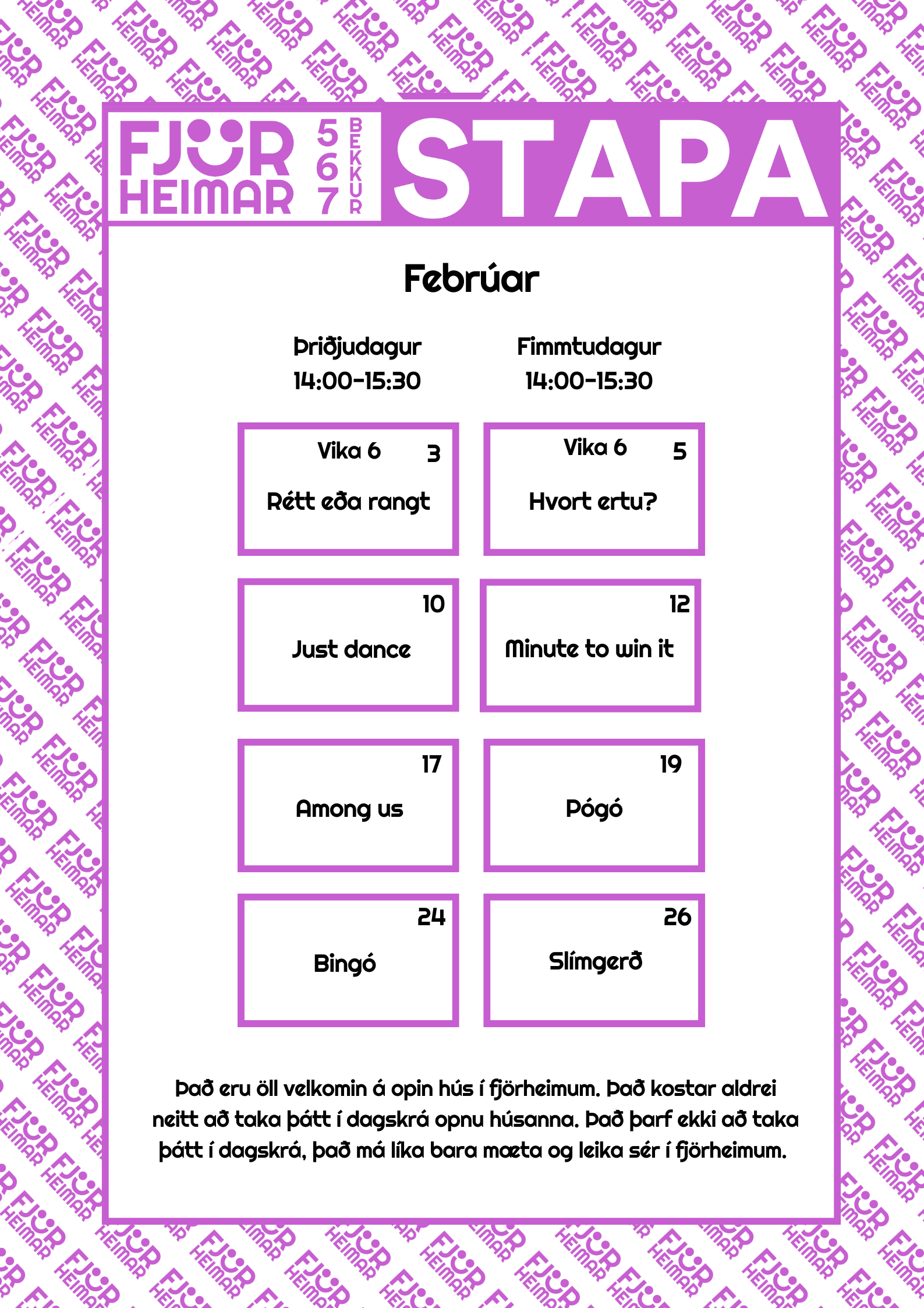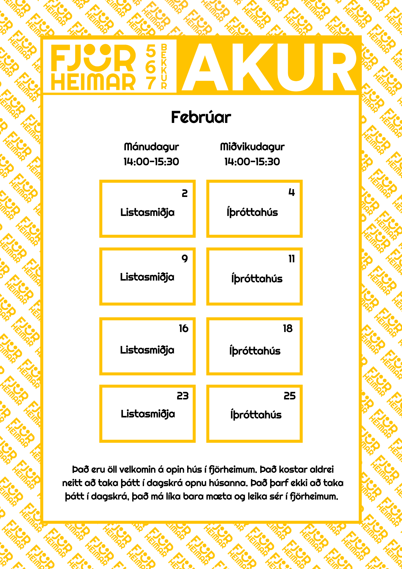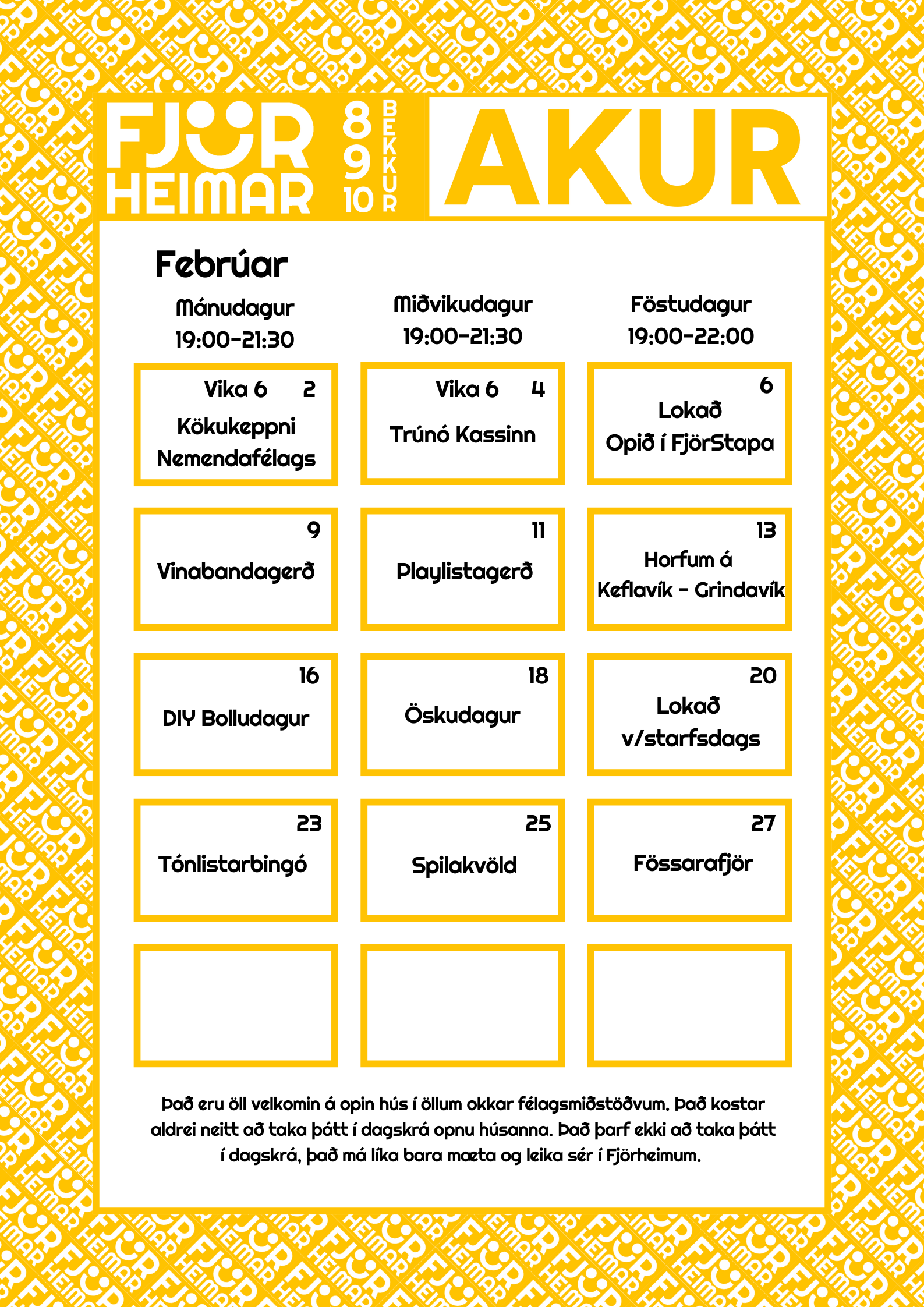 Með þessu fyrirkomulagi geta unglingar tekið þátt í starfi í sinni hverfisfélagsmiðstöð, en jafnframt eru allar félagsmiðstöðvar Fjörheima opnar öllum. Hver félagsmiðstöð er með tvær opnanir í viku fyrir 8.-10.bekk ásamt öðrum hverjum föstudegi, einnig er opið fyrir 5.-7.bekk tvo daga í viku ásamt séropnun fyrir 7.bekk einu sinni í viku. Nánari upplýsingar um hverja félagsmiðstöð fyrir sig má finna hér fyir neðan. Markmiðið er að félagsmiðstöðin sé áfram öruggur og jákvæður vettvangur þar sem börn og ungmenni geta hist, tekið þátt í skapandi og fjölbreyttu starfi og byggt upp vináttu og tengsl. Við hvetjum öll til að taka þátt í starfinu okkar, hvort sem það er í sinni hverfisfélagsmiðstöð eða annars staðar og við hlökkum til að taka á móti ykkur 💛