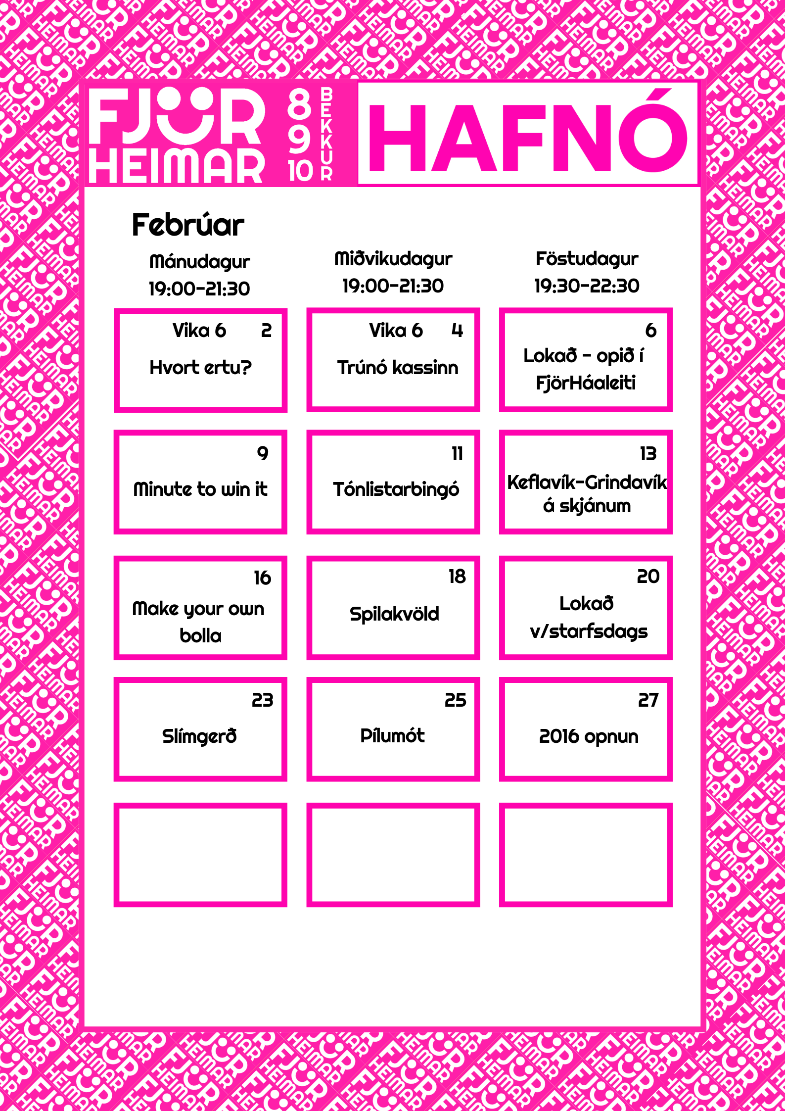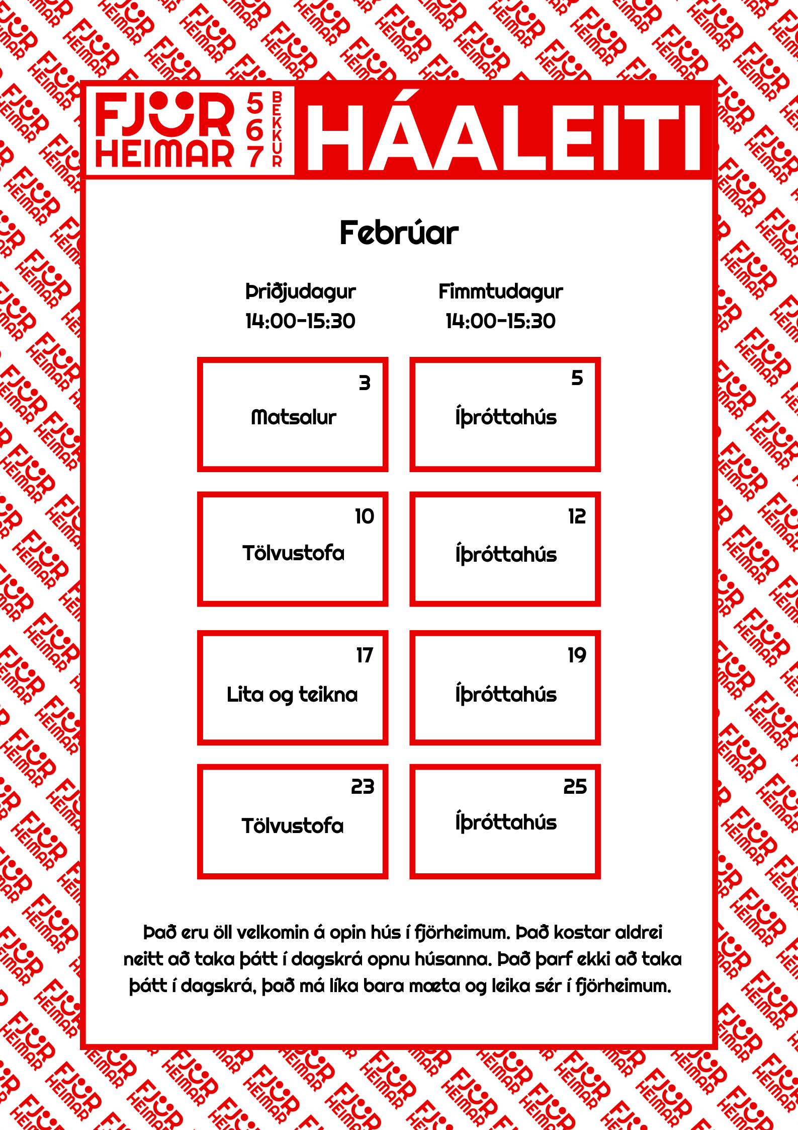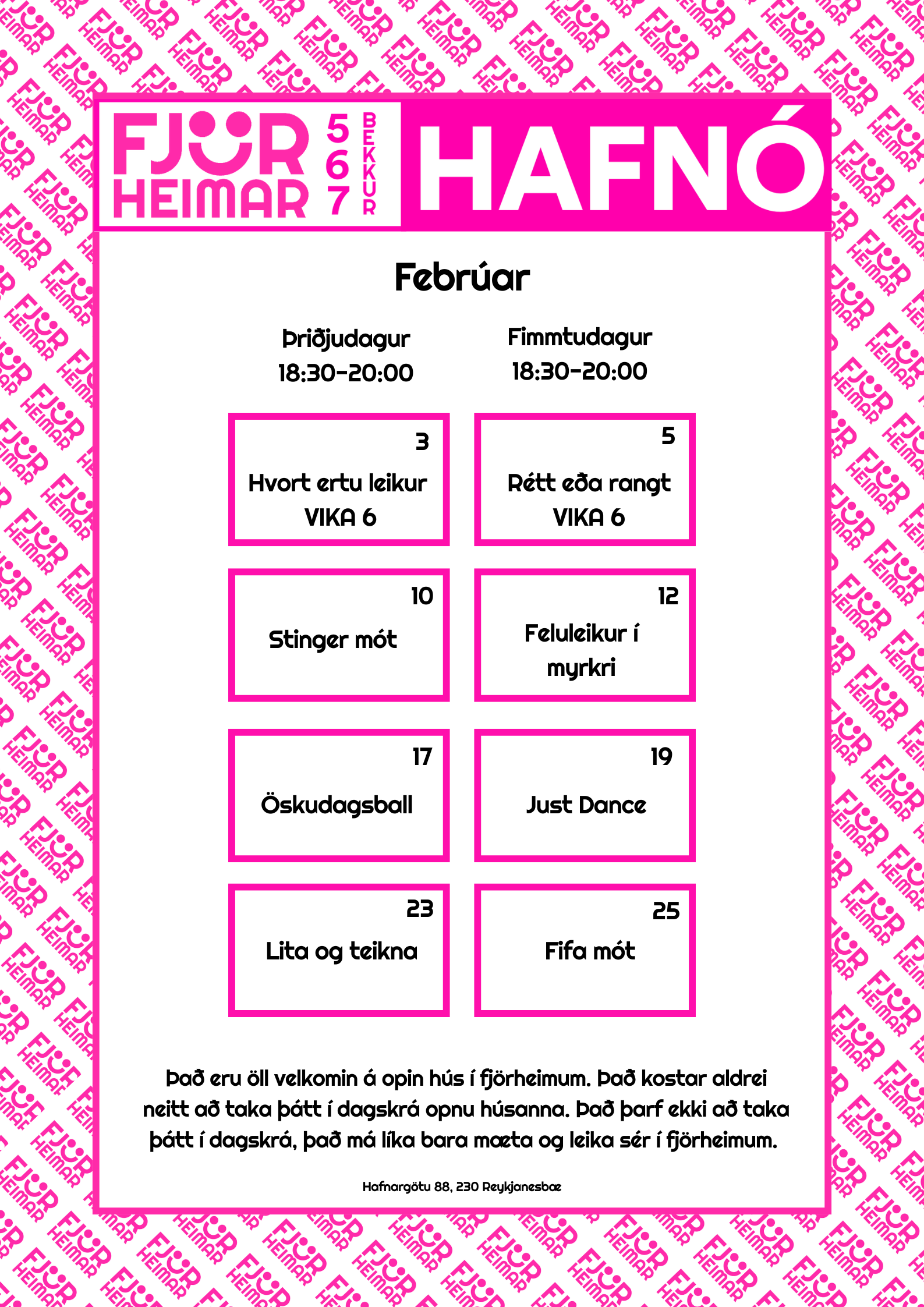Með þessu fyrirkomulagi geta unglingar tekið þátt í starfi í sinni hverfisfélagsmiðstöð, en jafnframt eru allar félagsmiðstöðvar Fjörheima opnar öllum. Hver félagsmiðstöð er með tvær opnanir í viku fyrir 8.-10.bekk ásamt öðrum hverjum föstudegi, einnig er opið fyrir 5.-7.bekk tvo daga í viku ásamt séropnun fyrir 7.bekk einu sinni í viku. Nánari upplýsingar um hverja félagsmiðstöð fyrir sig má finna hér fyir neðan. Markmiðið er að félagsmiðstöðin sé áfram öruggur og jákvæður vettvangur þar sem börn og ungmenni geta hist, tekið þátt í skapandi og fjölbreyttu starfi og byggt upp vináttu og tengsl. Við hvetjum öll til að taka þátt í starfinu okkar, hvort sem það er í sinni hverfisfélagsmiðstöð eða annars staðar og við hlökkum til að taka á móti ykkur 💛