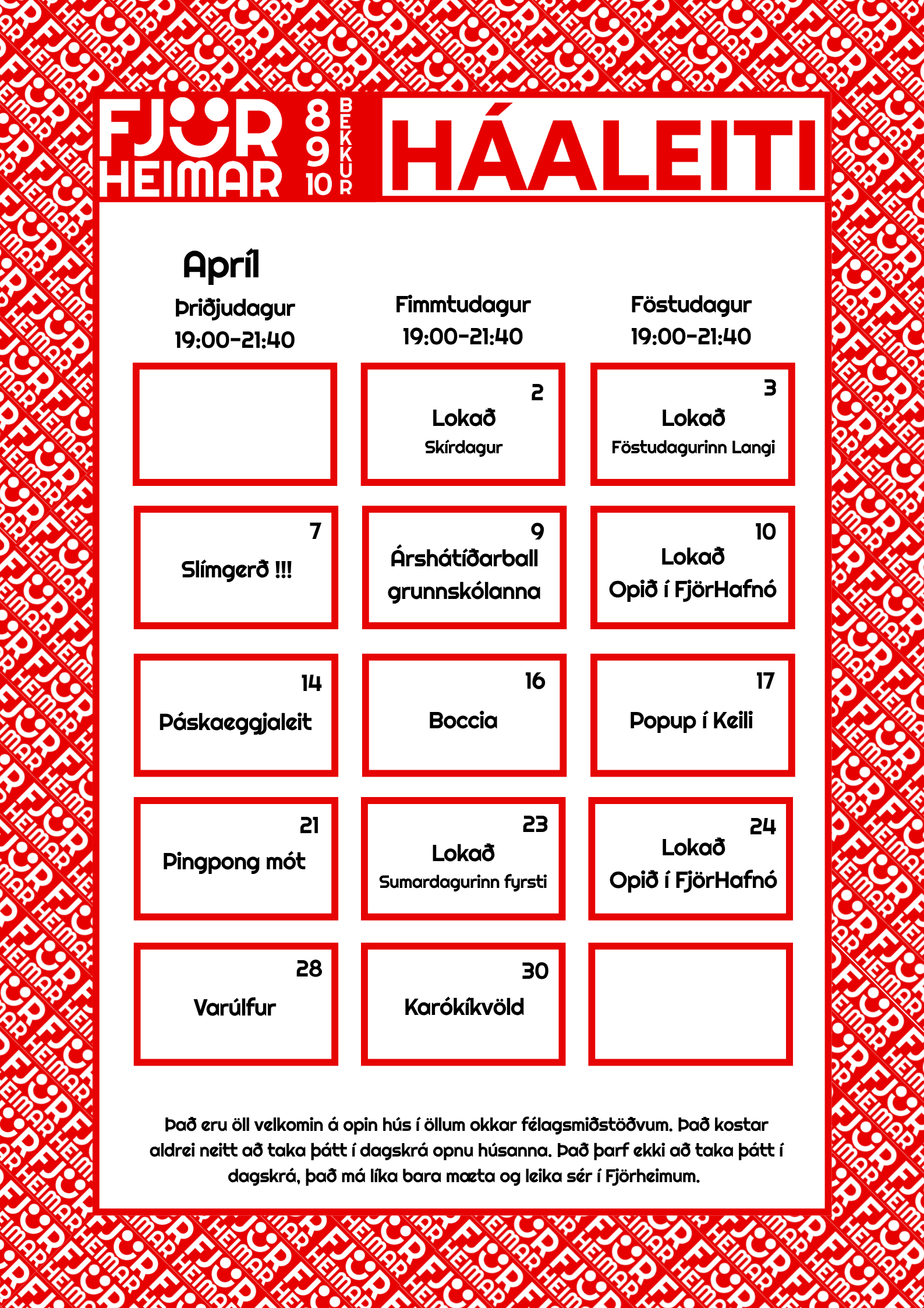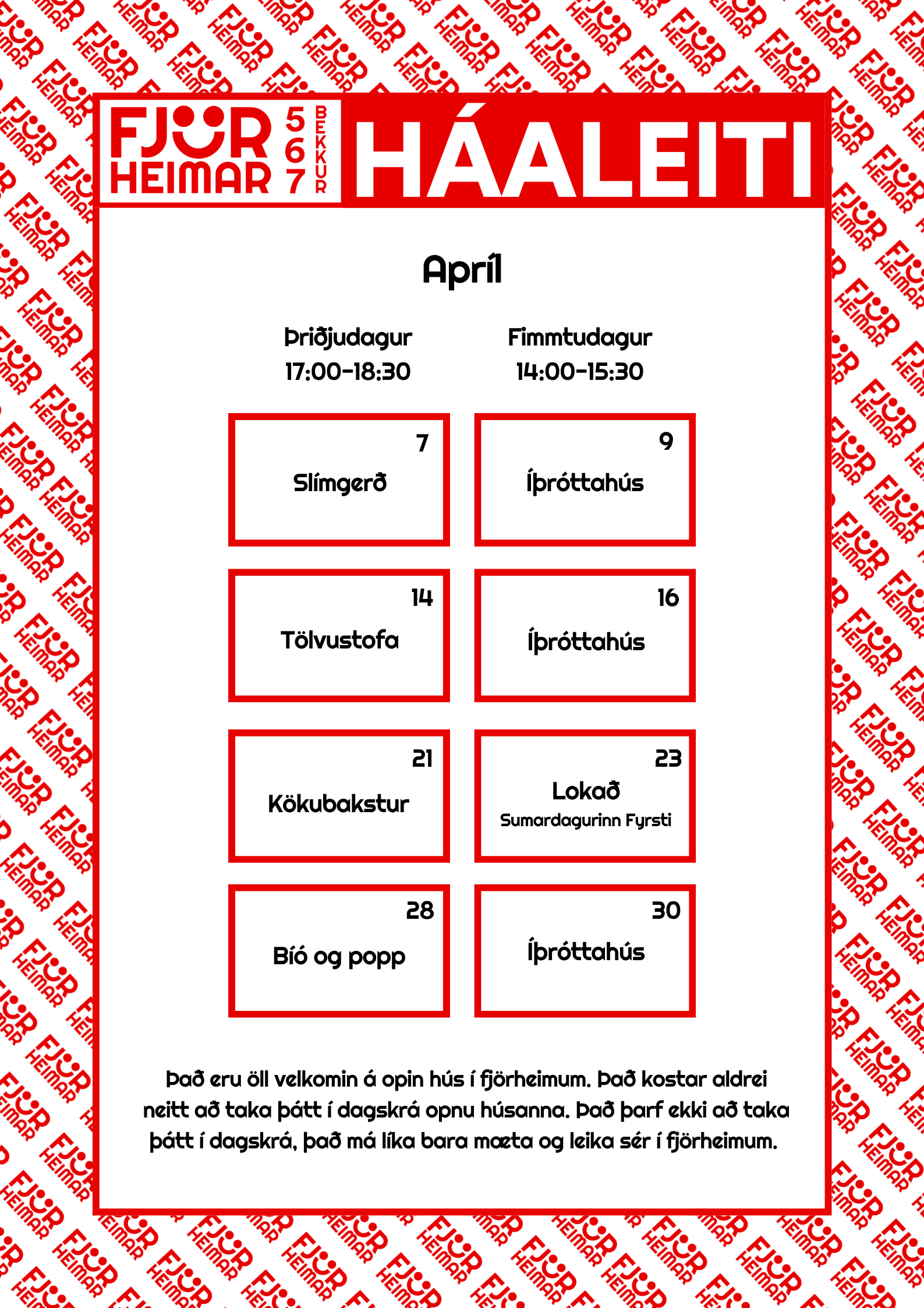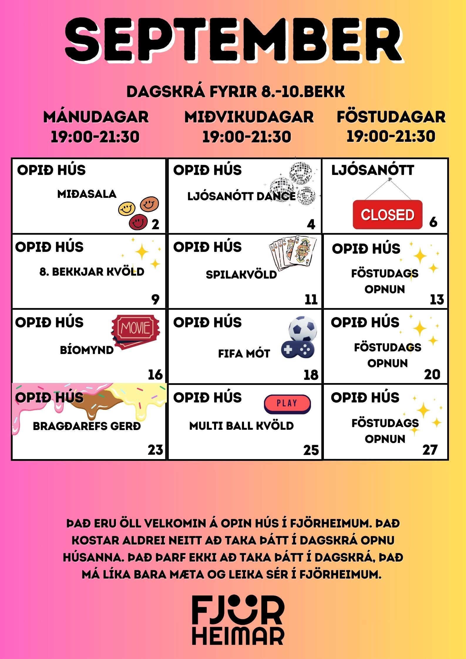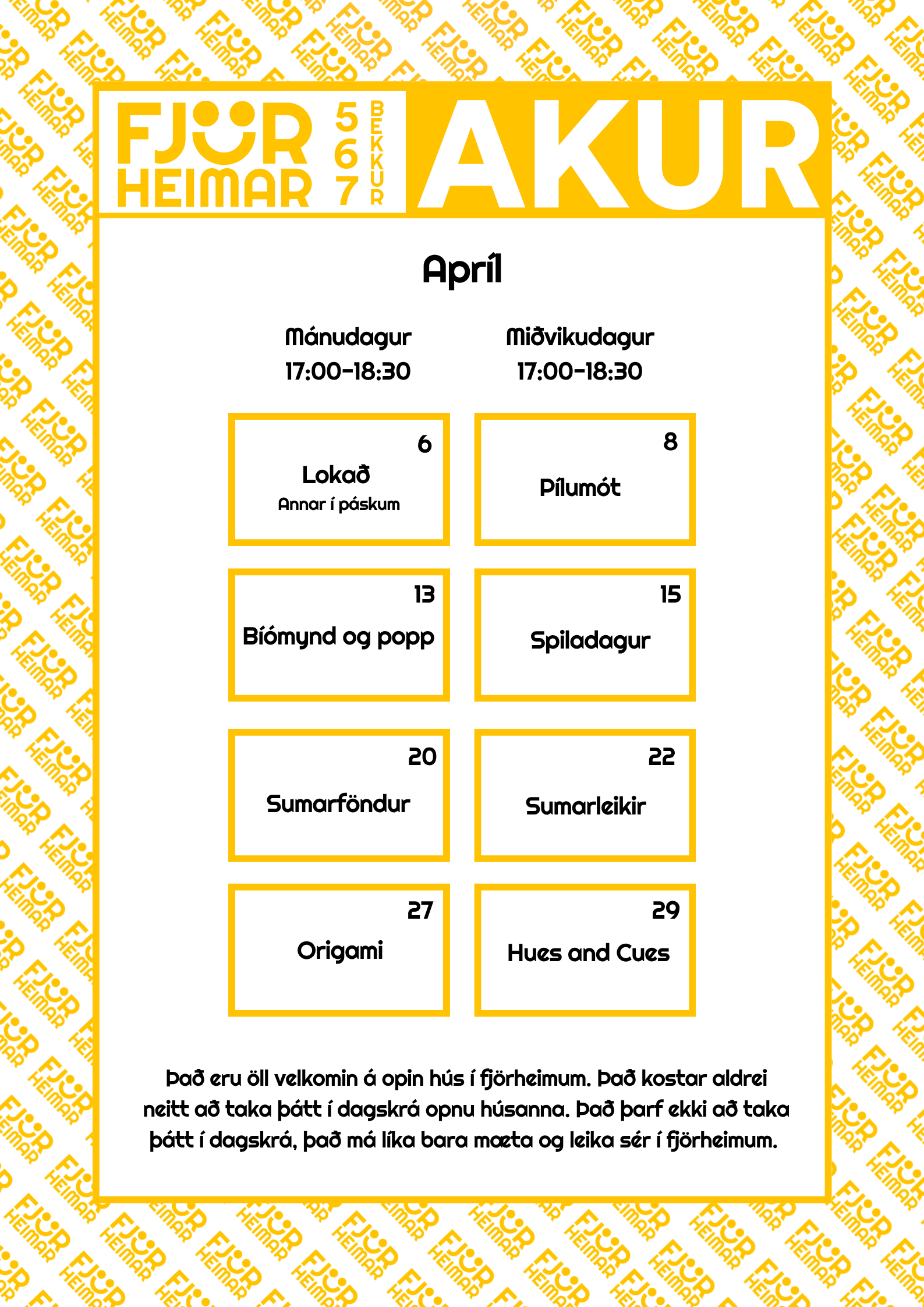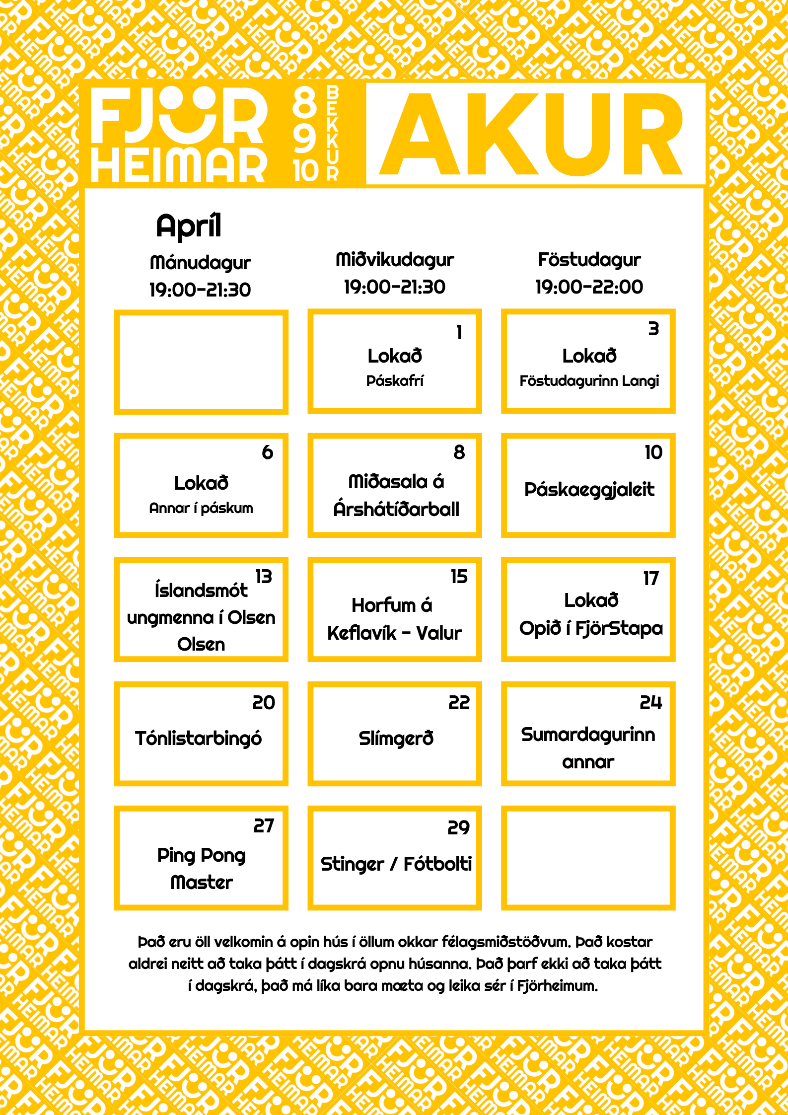 Með þessu fyrirkomulagi geta unglingar tekið þátt í starfi í sinni hverfisfélagsmiðstöð, en jafnframt eru allar félagsmiðstöðvar Fjörheima opnar öllum. Hver félagsmiðstöð er með tvær opnanir í viku fyrir 8.-10.bekk ásamt öðrum hverjum föstudegi, einnig er opið fyrir 5.-7.bekk tvo daga í viku ásamt séropnun fyrir 7.bekk einu sinni í viku. Nánari upplýsingar um hverja félagsmiðstöð fyrir sig má finna hér fyir neðan. Markmiðið er að félagsmiðstöðin sé áfram öruggur og jákvæður vettvangur þar sem börn og ungmenni geta hist, tekið þátt í skapandi og fjölbreyttu starfi og byggt upp vináttu og tengsl. Við hvetjum öll til að taka þátt í starfinu okkar, hvort sem það er í sinni hverfisfélagsmiðstöð eða annars staðar og við hlökkum til að taka á móti ykkur 💛