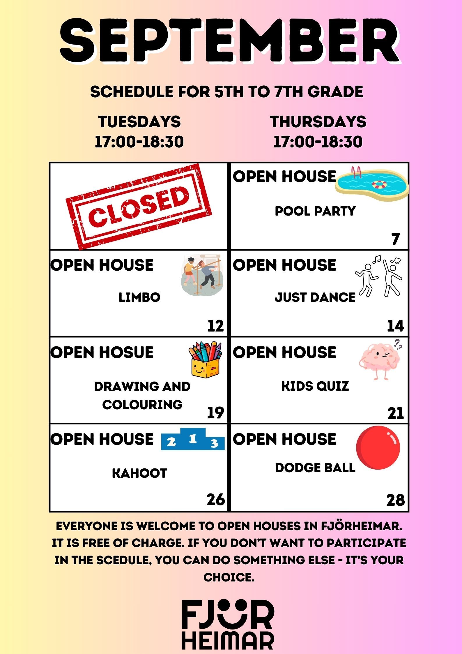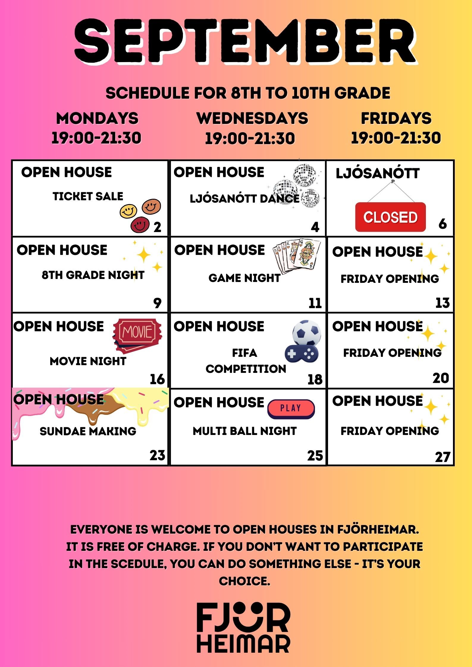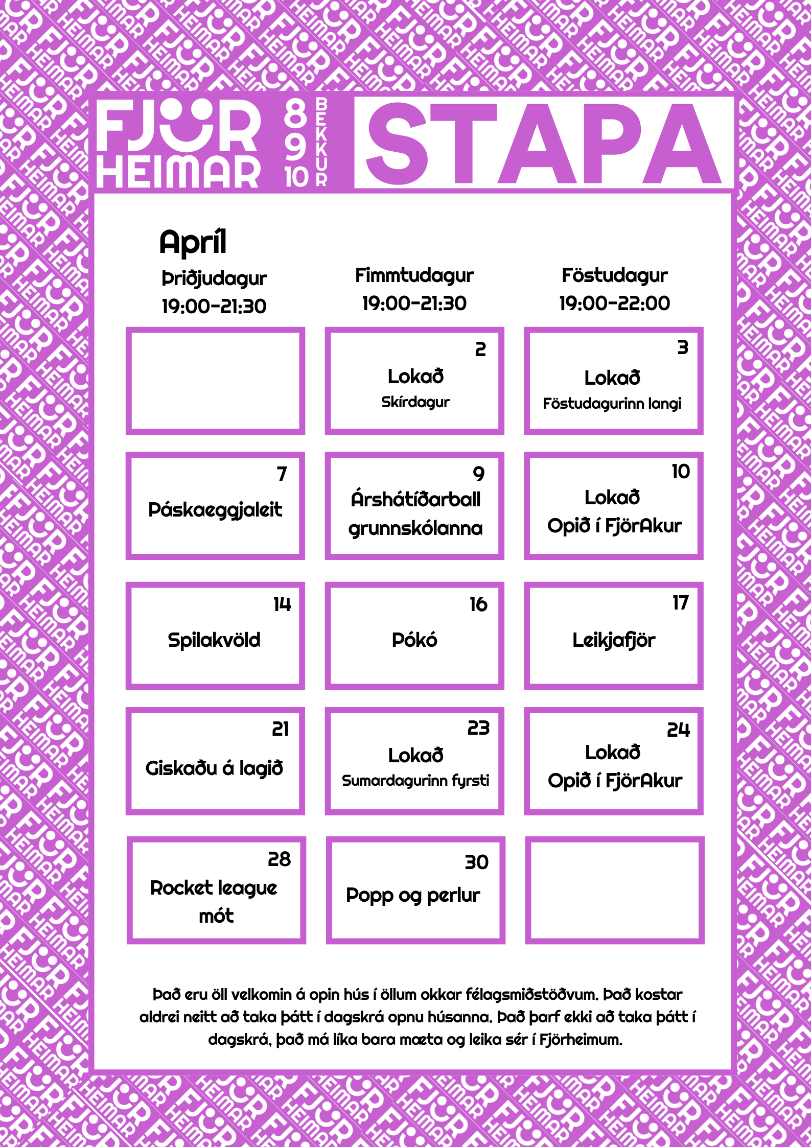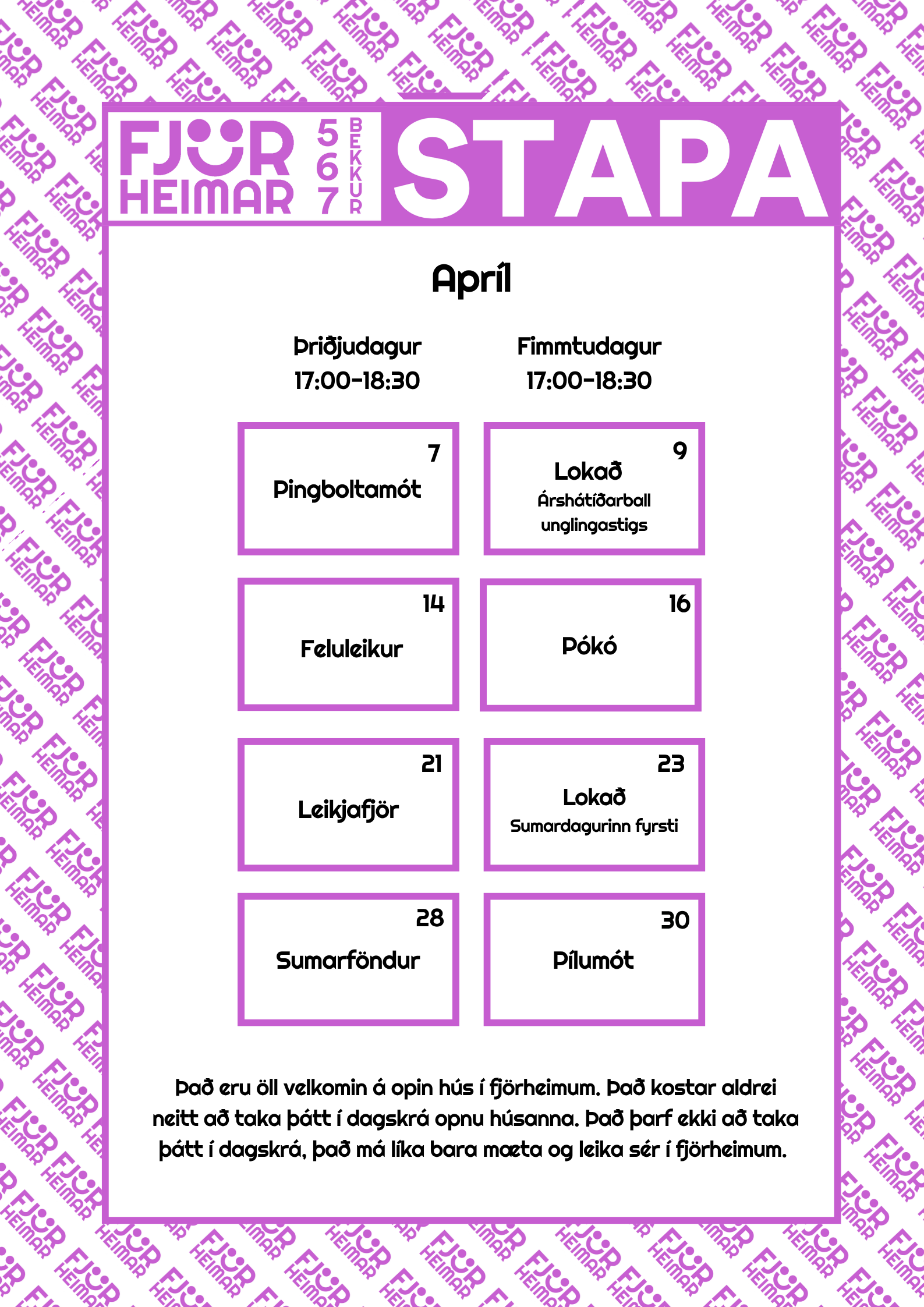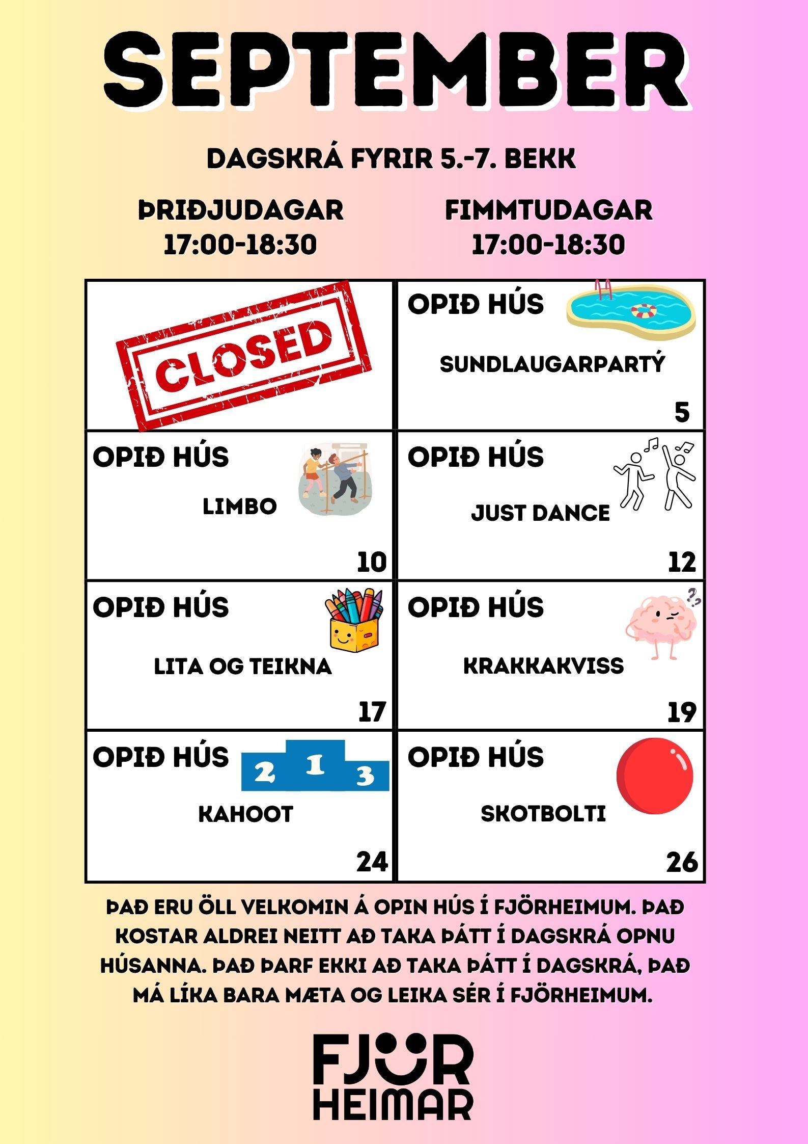 Með þessu fyrirkomulagi geta unglingar tekið þátt í starfi í sinni hverfisfélagsmiðstöð, en jafnframt eru allar félagsmiðstöðvar Fjörheima opnar öllum. Hver félagsmiðstöð er með tvær opnanir í viku fyrir 8.-10.bekk ásamt öðrum hverjum föstudegi, einnig er opið fyrir 5.-7.bekk tvo daga í viku ásamt séropnun fyrir 7.bekk einu sinni í viku. Nánari upplýsingar um hverja félagsmiðstöð fyrir sig má finna hér fyir neðan. Markmiðið er að félagsmiðstöðin sé áfram öruggur og jákvæður vettvangur þar sem börn og ungmenni geta hist, tekið þátt í skapandi og fjölbreyttu starfi og byggt upp vináttu og tengsl. Við hvetjum öll til að taka þátt í starfinu okkar, hvort sem það er í sinni hverfisfélagsmiðstöð eða annars staðar og við hlökkum til að taka á móti ykkur 💛