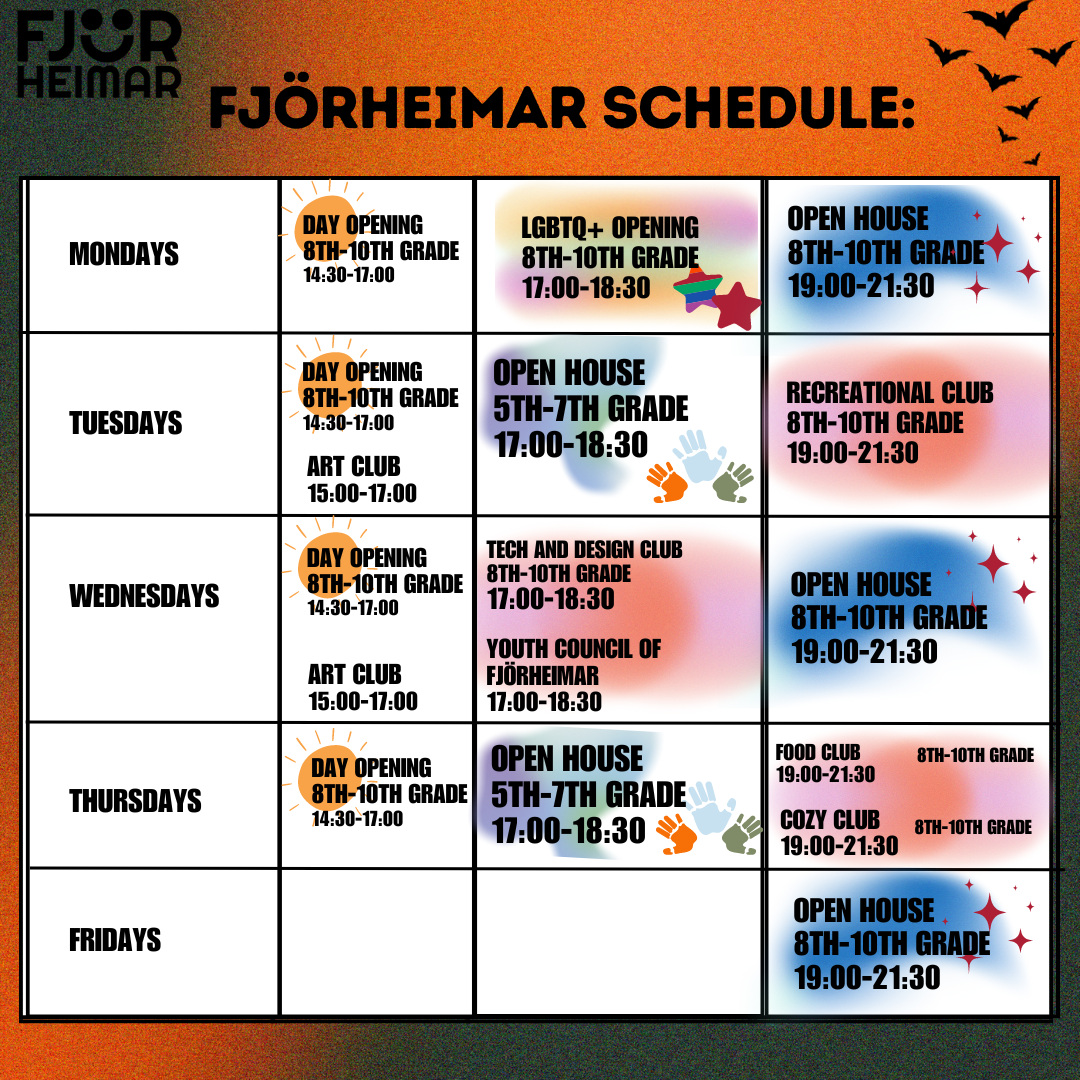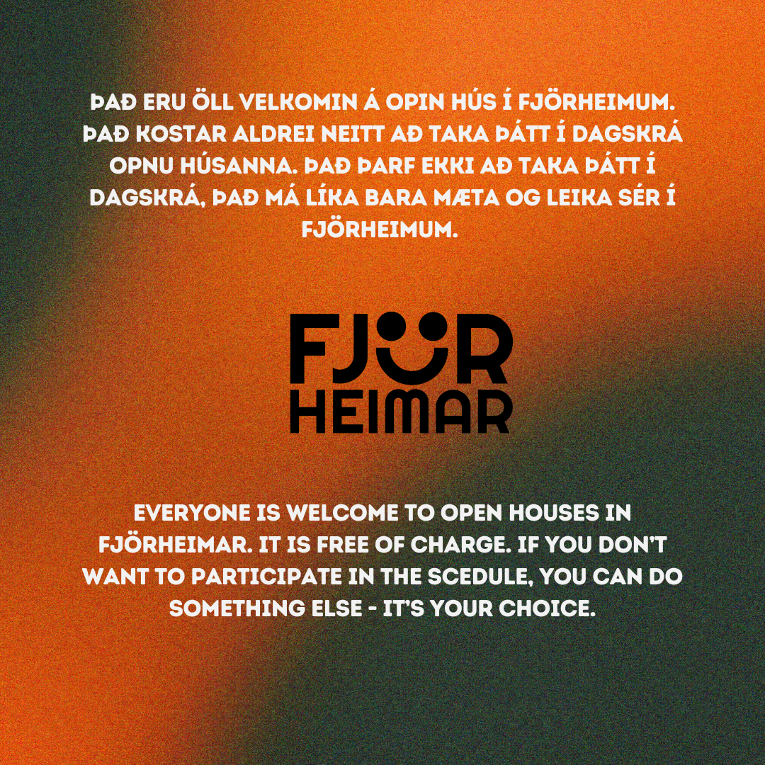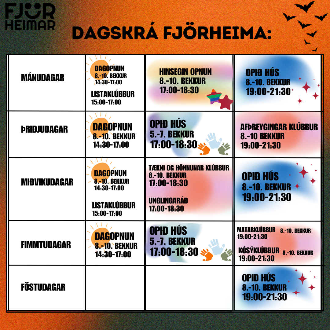 Með þessu fyrirkomulagi geta unglingar tekið þátt í starfi í sinni hverfisfélagsmiðstöð, en jafnframt eru allar félagsmiðstöðvar Fjörheima opnar öllum. Hver félagsmiðstöð er með tvær opnanir í viku fyrir 8.-10.bekk ásamt öðrum hverjum föstudegi, einnig er opið fyrir 5.-7.bekk tvo daga í viku ásamt séropnun fyrir 7.bekk einu sinni í viku. Nánari upplýsingar um hverja félagsmiðstöð fyrir sig má finna hér fyir neðan. Markmiðið er að félagsmiðstöðin sé áfram öruggur og jákvæður vettvangur þar sem börn og ungmenni geta hist, tekið þátt í skapandi og fjölbreyttu starfi og byggt upp vináttu og tengsl. Við hvetjum öll til að taka þátt í starfinu okkar, hvort sem það er í sinni hverfisfélagsmiðstöð eða annars staðar og við hlökkum til að taka á móti ykkur 💛