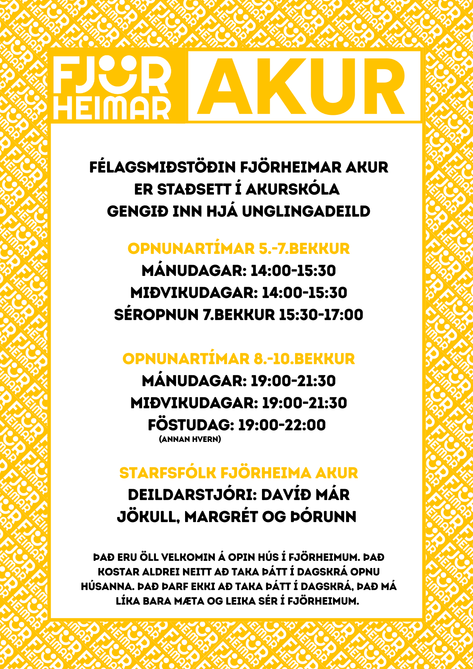 Með þessu fyrirkomulagi geta unglingar tekið þátt í starfi í sinni hverfisfélagsmiðstöð, en jafnframt eru allar félagsmiðstöðvar Fjörheima opnar öllum. Hver félagsmiðstöð er með tvær opnanir í viku fyrir 8.-10.bekk ásamt öðrum hverjum föstudegi, einnig er opið fyrir 5.-7.bekk tvo daga í viku ásamt séropnun fyrir 7.bekk einu sinni í viku. Nánari upplýsingar um hverja félagsmiðstöð fyrir sig má finna hér fyir neðan.