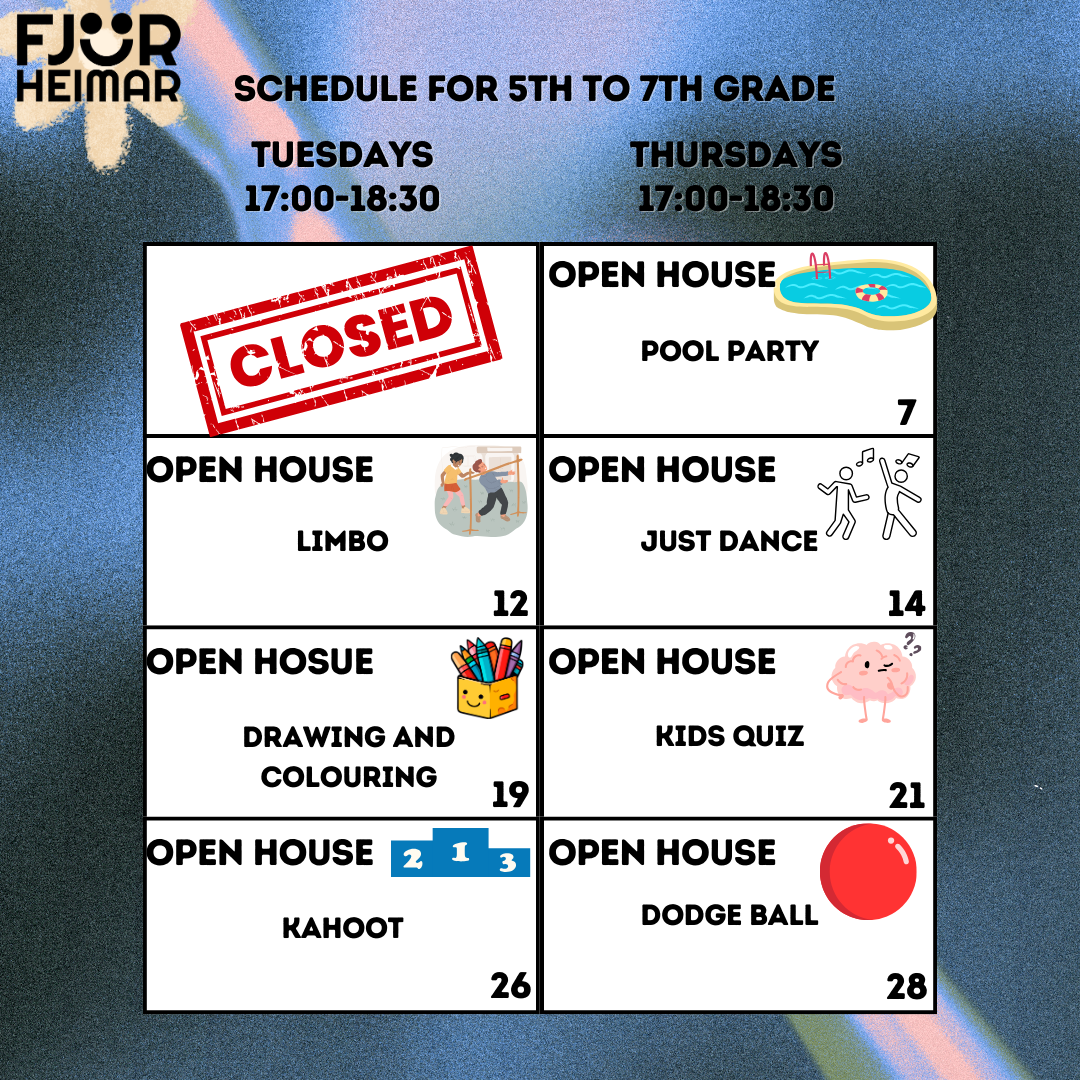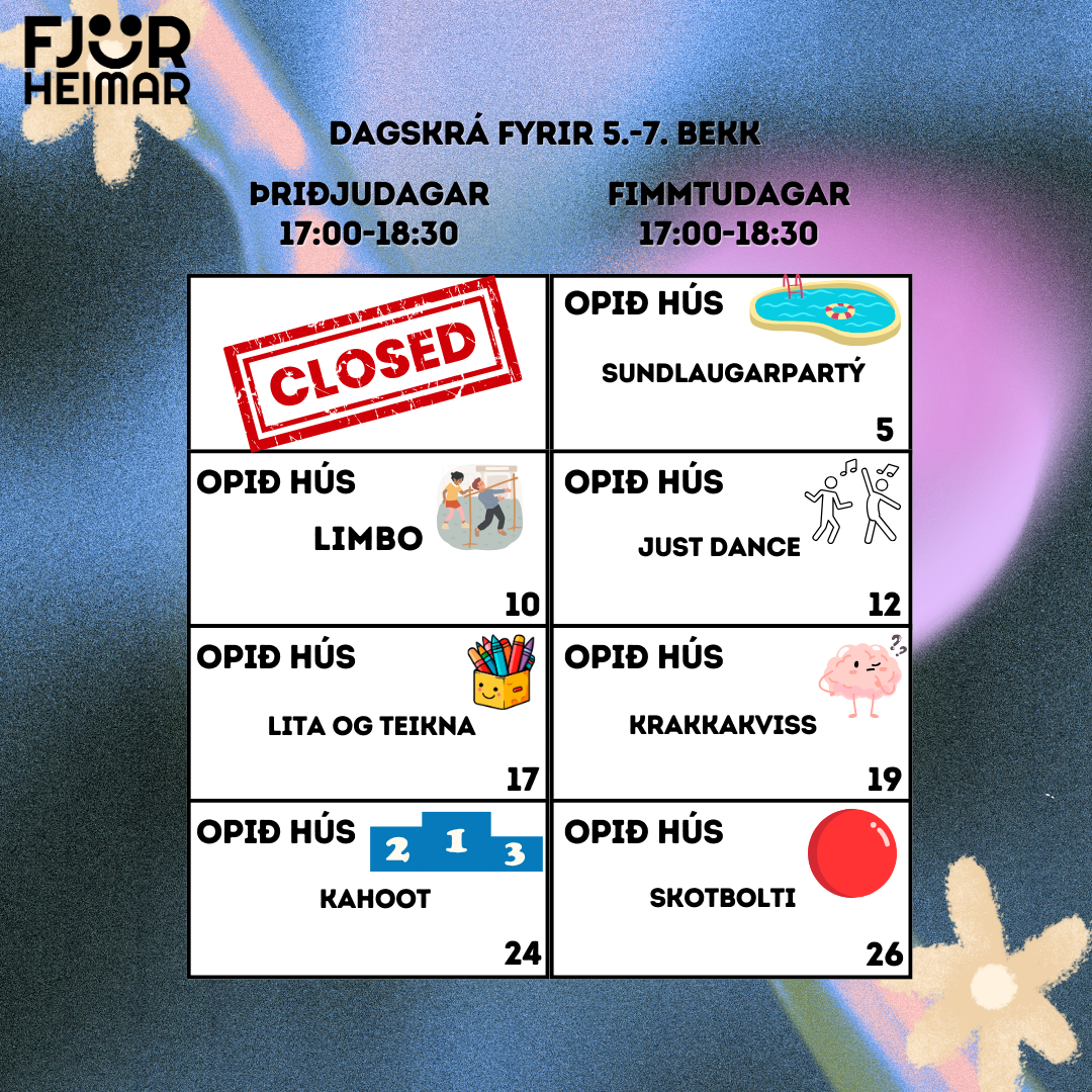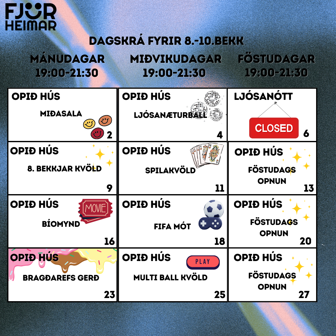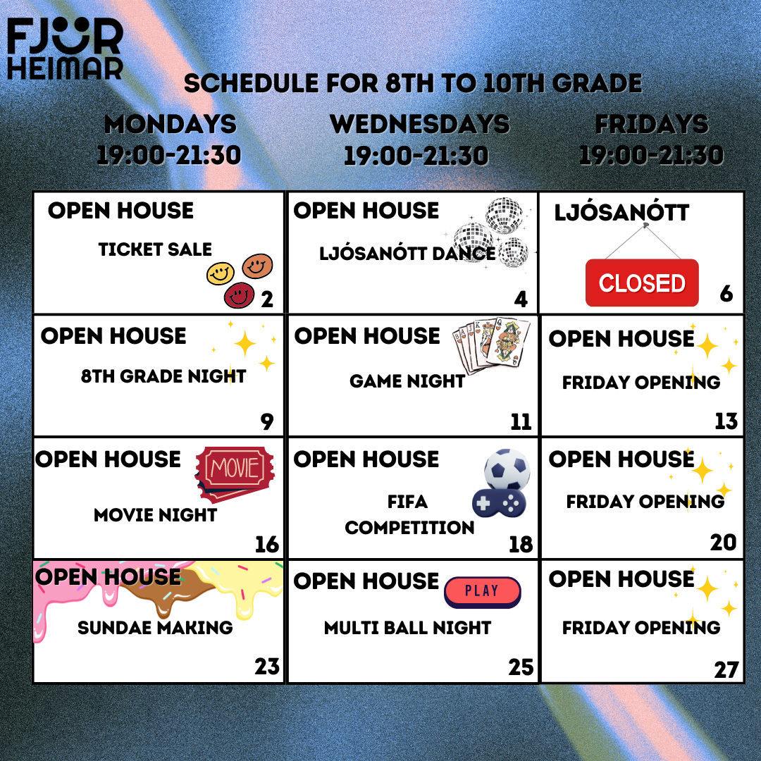 Með þessu fyrirkomulagi geta unglingar tekið þátt í starfi í sinni hverfisfélagsmiðstöð, en jafnframt eru allar félagsmiðstöðvar Fjörheima opnar öllum. Hver félagsmiðstöð er með tvær opnanir í viku fyrir 8.-10.bekk ásamt öðrum hverjum föstudegi, einnig er opið fyrir 5.-7.bekk tvo daga í viku ásamt séropnun fyrir 7.bekk einu sinni í viku. Nánari upplýsingar um hverja félagsmiðstöð fyrir sig má finna hér fyir neðan. Markmiðið er að félagsmiðstöðin sé áfram öruggur og jákvæður vettvangur þar sem börn og ungmenni geta hist, tekið þátt í skapandi og fjölbreyttu starfi og byggt upp vináttu og tengsl. Við hvetjum öll til að taka þátt í starfinu okkar, hvort sem það er í sinni hverfisfélagsmiðstöð eða annars staðar og við hlökkum til að taka á móti ykkur 💛